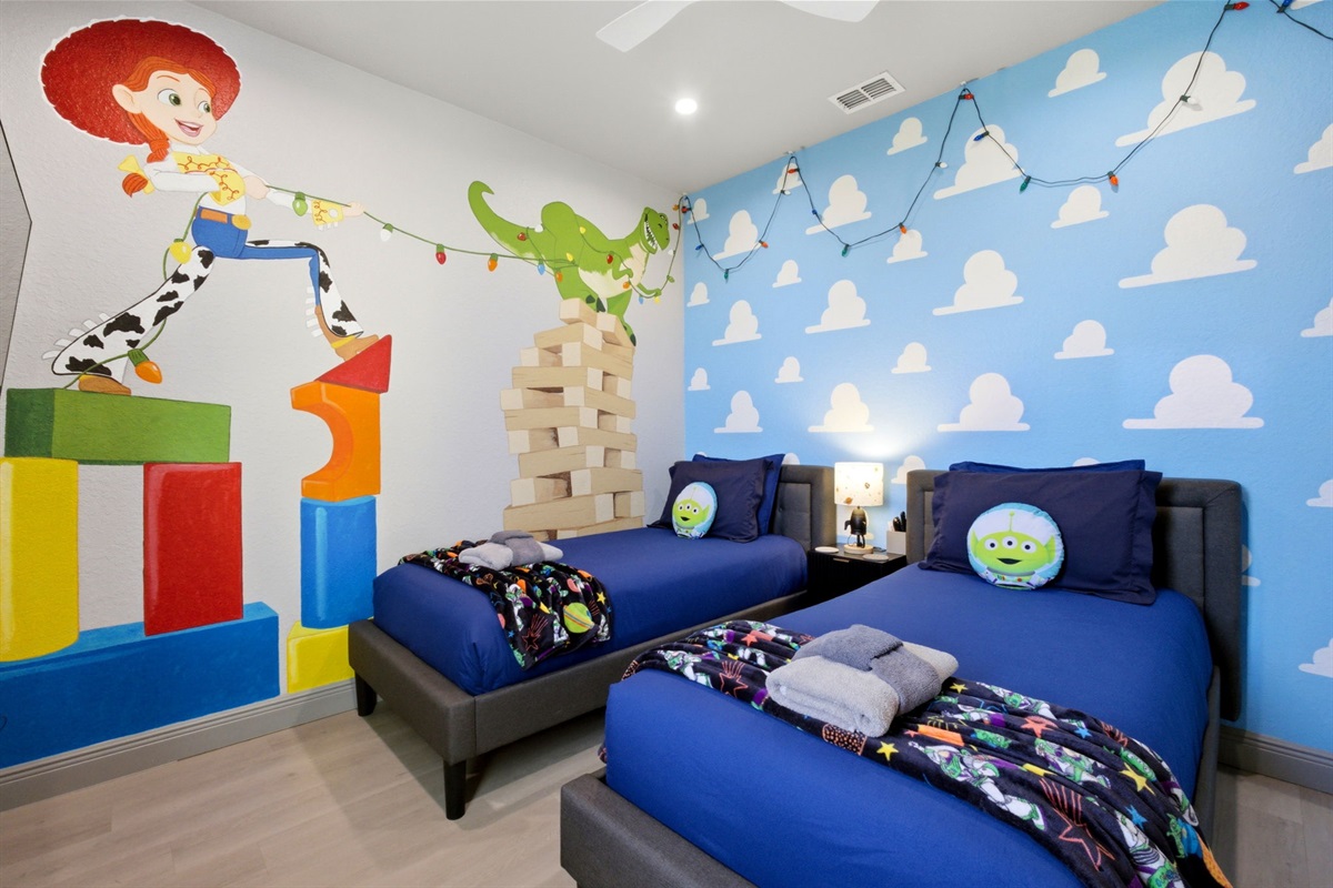 Kids Bedroom (Twin/Twin Beds): A magical Toy Story-themed room complete with 9-foot murals and fun details from "Andy's Room." This room is perfect for 2 children or adults and includes a ceiling fan, wall-mounted smart TV, and plenty of whimsical charm.