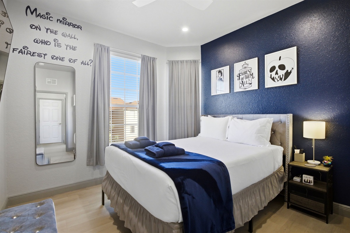 Second Bedroom (Queen Bed): A comfortable room with a queen bed, a ceiling fan, and a wall-mounted smart TV. "Villain themed"
