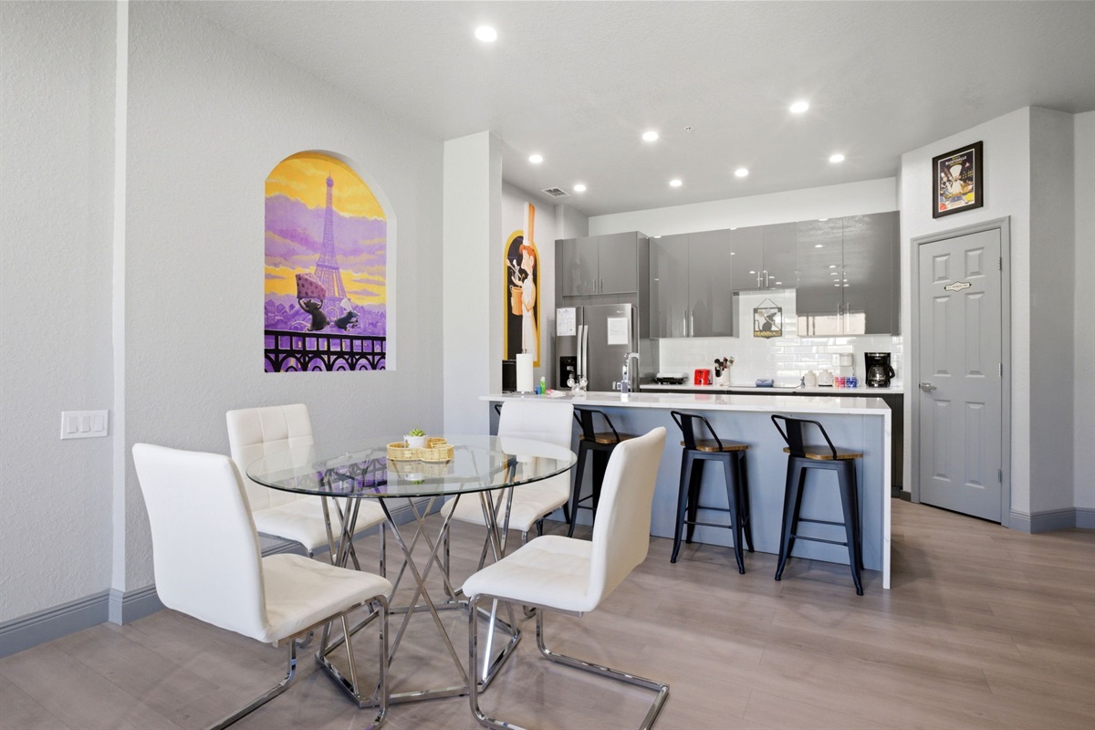 The spacious kitchen, living, and dining areas are the heart of the condo, perfect for both casual meals and entertaining. The newly remodeled kitchen comes fully equipped with brand-new appliances and sleek finishes, offering bar seating for four. The adjacent dining area also seats four, providing a cozy space for family meals.