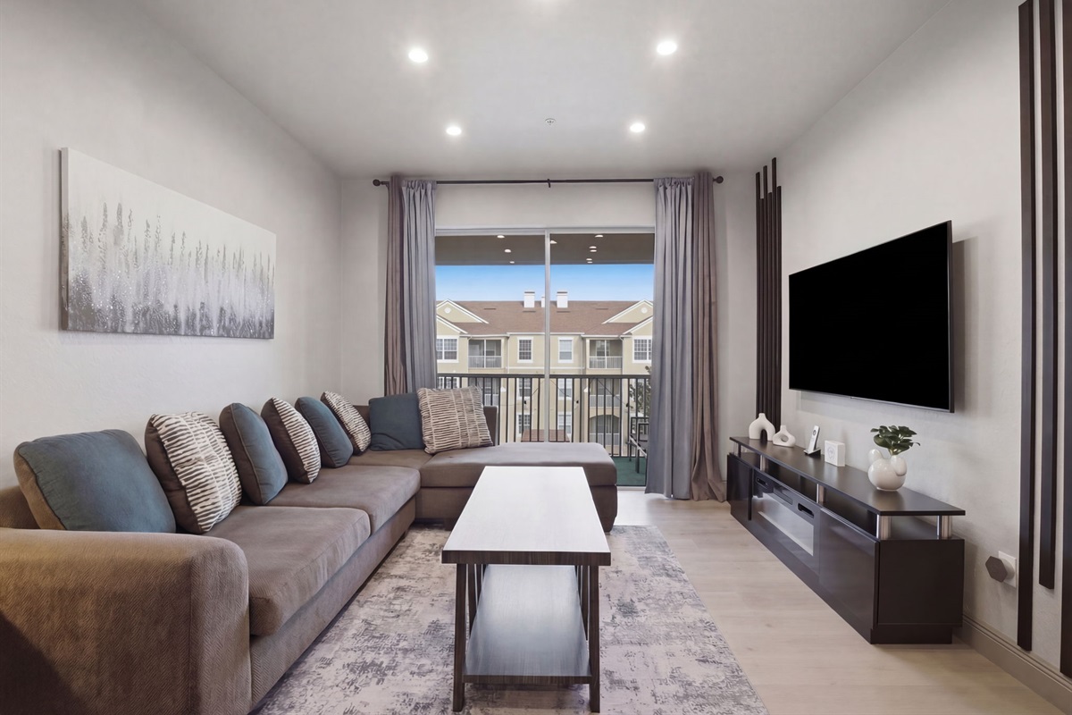 Relax in the inviting living room with a large sectional sofa and a flat-screen smart TV – the perfect spot for unwinding after a busy day. The living area opens to a screened-in balcony with an outdoor seating area, where you can enjoy your morning coffee or evening drink while soaking in the serene view. The East-facing balcony offers sunlight in the morning and shade in the afternoon, making it a peaceful escape.